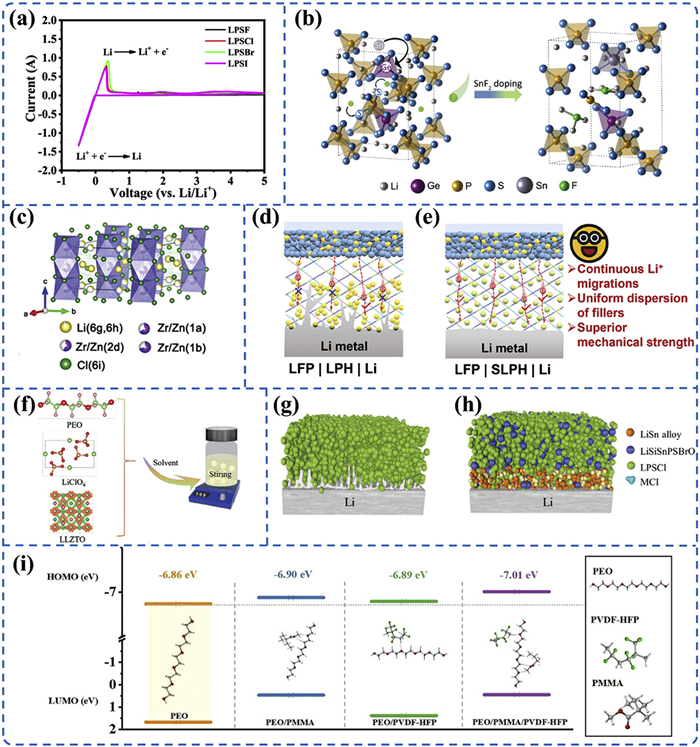| Fig. 7. (a) CV test results of the Li7.3P2.9S10.75X0.3 (X = F, Cl, Br, I) electrolyte systems. Reproduced with permission [75]. Copyright 2025, American Chemical Society. (b) Schematic of SnF2-doped LGPS. Reproduced with permission [77]. Copyright 2024, Wiley-VCH. (c) Crystal structure schematic of Li2.4Zr0.8Zn0.2Cl6 prepared via Zn doping of Li2ZrCl6 (LZC). Reproduced with permission [32]. Copyright 2025, Wiley-VCH. (d) Interfacial instability induced by agglomeration of LATP particles. (e) Schematic illustrating the advantages of composite SSEs. Reproduced with permission [82]. Copyright 2025, Wiley-VCH. (f) Synthesis schematic of PEO-LiClO4-LLZTO composite SSEs. Reproduced with permission [83]. Copyright 2024, Wiley-VCH. (g) Schematic of lithium dendrites at the Li5.3PS4.3Cl1.7/LMA interface. (h) Schematic of stable interface between composite SSEs and LMA. Reproduced with permission [33]. Copyright 2025, Wiley-VCH. (i) Electrochemical stability windows of different composite solid polymer electrolytes. Reproduced with permission [86]. Copyright 2023, Elsevier. | |