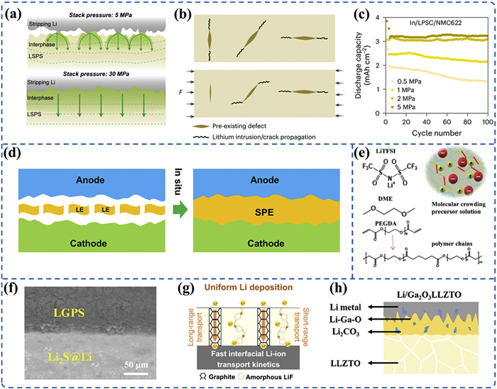 | Fig. 8. (a) Schematic of interfacial pressure affecting physical contact at the LGPS/LMA interface. Reproduced with permission [34]. Copyright 2021, American Chemical Society. (b) Schematic of external pressure healing interfacial microcracks. Reproduced with permission [87]. Copyright 2023, Springer Nature. (c) Relationship between interfacial pressure and discharge specific capacity in ASSLMB systems. Reproduced with permission [88]. Copyright 2025, Springer Nature. (d) Principle schematic of in situ polymerization technology. Reproduced with permission [91]. Copyright 2021, Elsevier. (e) Chemical equation for polymerization reaction between PEGDA and DME. Reproduced with permission [36]. Copyright 2024, Wiley-VCH. (f) Schematic of Li2S protective layer at LGPS/LMA interface. Reproduced with permission [97]. Copyright 2024, Wiley-VCH. (g) Schematic of high-speed ion transport channels in AFI interphase. Reproduced with permission [98]. Copyright 2025, Elsevier. (h) Schematic of Li-Ga-O layer construction at LLZTO/LMA interface. Reproduced with permission [35]. Copyright 2022, American Chemical Society. | |