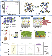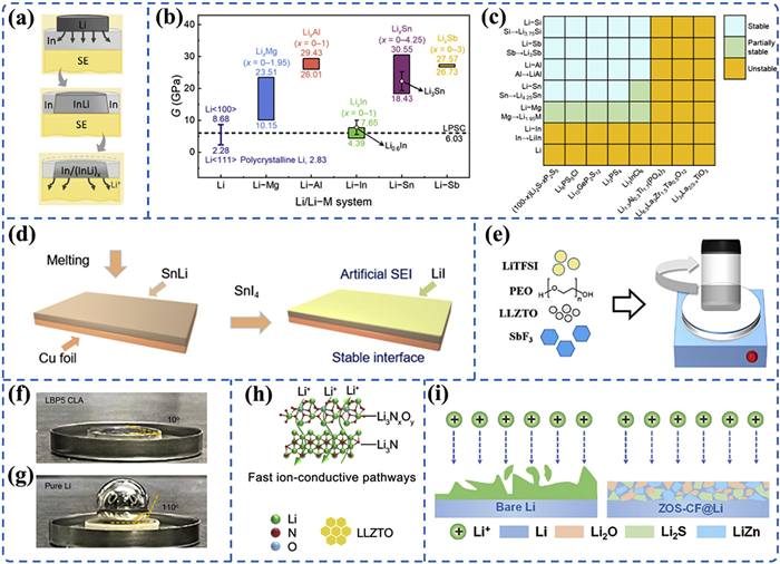 | Fig. 9. (a) Schematic of self-diffusion forming Li-In alloy. Reproduced with permission [37]. Copyright 2024, Wiley-VCH. (b) Shear modulus comparison of lithium alloy types. (c) Interfacial microcrack healing under external pressure. Reproduced with permission [106]. Copyright 2024, American Chemical Society. (d) Fabrication process for LiI-protected lithium alloy anode. Reproduced with permission [107]. Copyright 2024, American Chemical Society. (e) Blending strategy for SbF3-PEO-LLZTO composite electrolyte preparation. Reproduced with permission [108]. Copyright 2023, Elsevier. (f) Contact angle between molten Li-BP composite anode and LLZTO. (g) Contact angle of molten lithium on LLZTO surface. Reproduced with permission [111]. Copyright 2024, Elsevier. (h) Lithium ion transport channels within the composite anode bulk phase. Reproduced with permission [38]. Copyright 2023, Royal Society of Chemistry. (i) Lithiophilic host-guided uniform lithium deposition. Reproduced with permission [116]. Copyright 2024, Wiley-VCH. | |