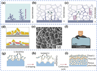 | Fig. 5. (a) Schematic of an ideal stable interface between SSEs and LMA. (b) Schematic of semi-stable interface formation. (c) Schematic of destabilized interface formation. Reproduced with permission [59]. Copyright 2023, Wiley-VCH. (d) Schematic illustrating increased local current density due to dendrite-induced electric field distortion. Reproduced with permission [61]. Copyright 2025, Wiley-VCH. (e) SEM image of lithium dendrites growing along LLZO grain boundaries. Reproduced with permission [62]. Copyright 2025, American Chemical Society. (f) Schematic showing microcrack propagation in LLZO caused by lithium deposition. Reproduced with permission [63]. Copyright 2022, Springer Nature. (g) Schematic of lithium dendrites morphology. (h) Schematic of "dead lithium" formation during stripping. (i) Schematic of "dead lithium layer" accumulation after multiple deposition/stripping cycles. Reproduced with permission [30]. Copyright 2017, Springer Nature. | |
