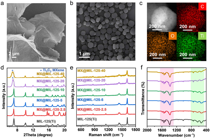 | Fig. 1. The SEM images of (a) MXene and (b) MX@MIL-125-20, (x = 2.5, 5, 10, 20, 40). (c) The elemental mapping of MX@MIL-125-20, (d) Powder XRD pattern, (e) FTIR, and (f) Raman spectroscopy. | |