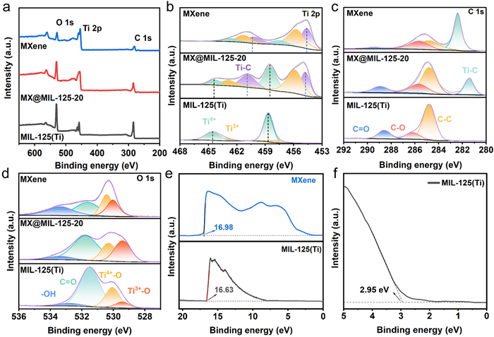 | Fig. 2. XPS spectra of (a) full spectrum, high-resolution (b) Ti 2p, (c) C 1s, and (d) O 1s, (e) UPS spectrum of MIL-125(Ti) and Ti3C2 MXene and (f) valence band spectrum of MIL-125(Ti). | |