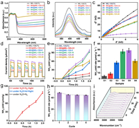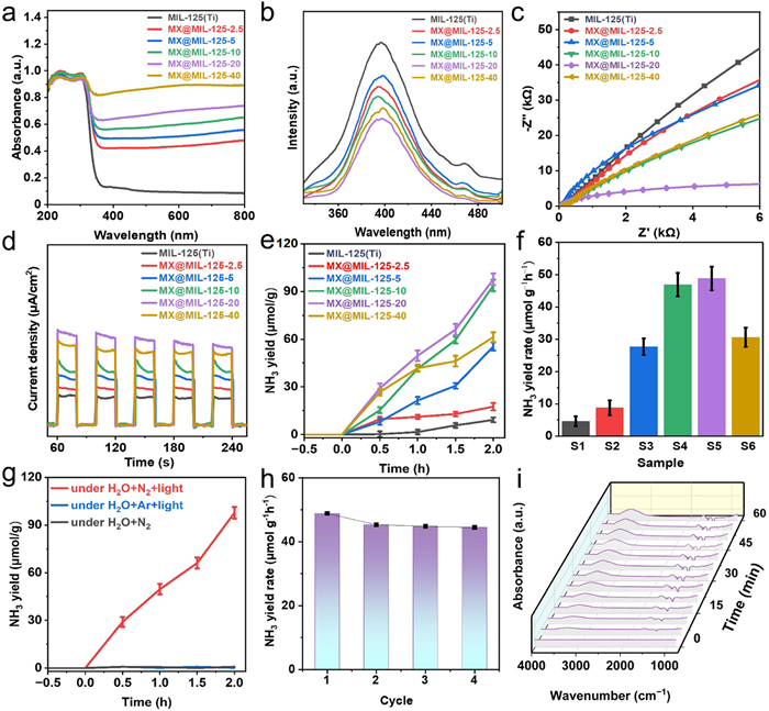 | Fig. 3. (a) UV–vis DRS, (b) photoluminescence spectra, (c) electrochemical impedance spectra, (d) transient photocurrent response, (e) photocatalytic NH3 evolution over time, (f) the NH3 formation rate over MX@MIL-125-x samples, (g) control blank experiment, (h) cyclic experiments and (i) in-situ FT-IR. | |