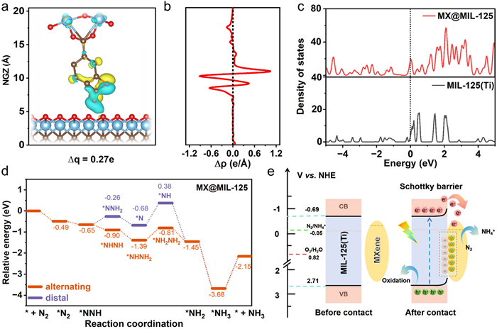 | Fig. 4. (a) Calculated charge density difference of MX@MIL-125, where cyan and yellow areas indicate charge depletion and accumulation. (b) Plane charge density of Δρ(z) along the z axis, (c) density of states of Ti 3d orbital, (d) free energy calculation for N2 reduction on MX@MIL-125. (e) Possible mechanism for photocatalytic reduction of N2 to NH3 upon MX@MIL-125. | |