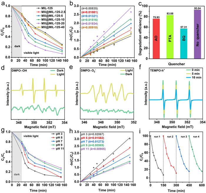 | Fig. 5. (a) Photocatalytic degradation of TCH under visible light by MIL-125(Ti) and MX@MIL-125. (b) Linear fitting for pseudo-first-order kinetics. (c) Photocatalytic degradation of TCH by MX@MIL-125-20 with different quenchers. EPR spectra of MX@MIL-125 with DMPO (d) in DI water, in MeOH (e), and (f) TEMPO in DI solution. (g) Photocatalytic degradation of TCH by MX@MIL-125-20 at different pH levels. (h) Pseudo-first-order kinetics and rate constant (k) at different pH levels. (i) Recycling tests of MX@MIL-125-20. | |