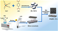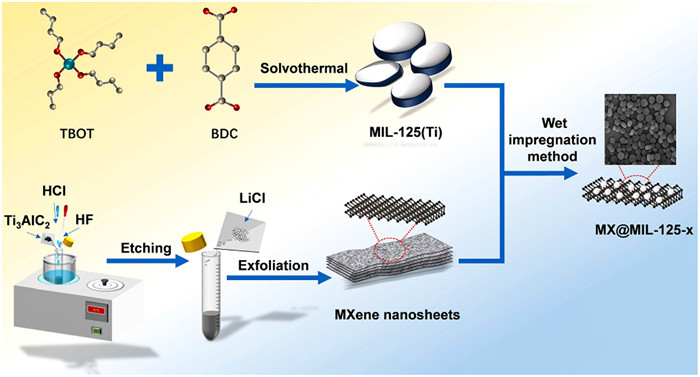 Nano MIL-125(Ti) was prepared by the assembly of TBOT and BDC organic linker by the solvothermal method. Ti3C2 MXene monolayers or a few layers were fabricated from acid etching of Ti3AlC2 bulk crystals and subsequent exfoliation of the accordion-like structure through LiCl intercalation, then the solid MXene was obtained from dry freezing. Finally, MX@MIL-125 composites were synthesized by wet impregnation method (Detail synthetic pathways of MIL-125(Ti), Ti3C2 MXene and MX@MIL-125 composites are shown in Supporting information). Nano MIL-125(Ti) with cake-like morphology were bonded onto the surface of the Ti3C2 MXene nanosheets by electrostatic interactions (Scheme 1) [25].