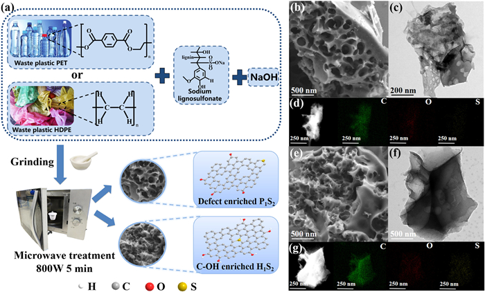 The appearance alongside pore features of carbon materials were examined utilizing scanning electron microscopy (SEM) and transmission electron microscopy (TEM) in Figs. 1b-g [28]. The non-metallic porous carbon catalysts P1S2 and H1S2 derived from waste plastics PET and HDPE exhibited significant porous structural characteristics. The formation of porous structures was not only attributed to the gases emitted during the pyrolysis of plastics and sodium lignosulfonate [29,30], which facilitated the pore formation, but also ascribed to the fact that NaOH, the activation reagent encapsulated in plastics-derived carbon material, was washed out to produce porosity. TEM element mapping (Figs. 1d and g) showed well distribution of C, O, and S in P1S2 and H1S2 [26].