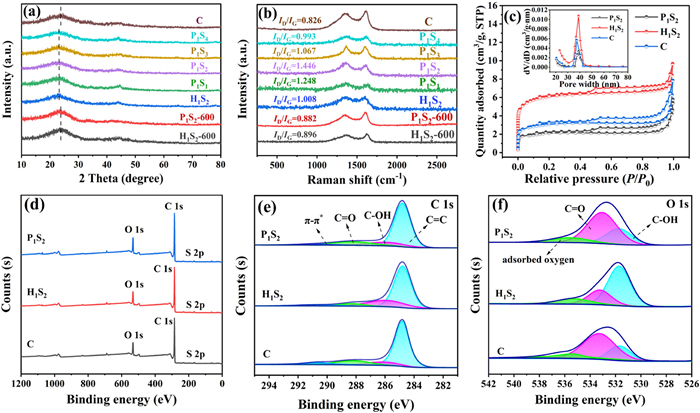 | Fig. 2. (a) XRD patterns and (b) Raman spectroscopy of C, P1S4, P1S3, P1S2, P1S1, H1S2, P1S2–600 and H1S2–600. (c) Nitrogen adsorption desorption curves of P1S2, H1S2 and C (Inset: pore size distribution). The XPS survey (d), high resolution XPS for C 1s (e) and O 1s (f). | |