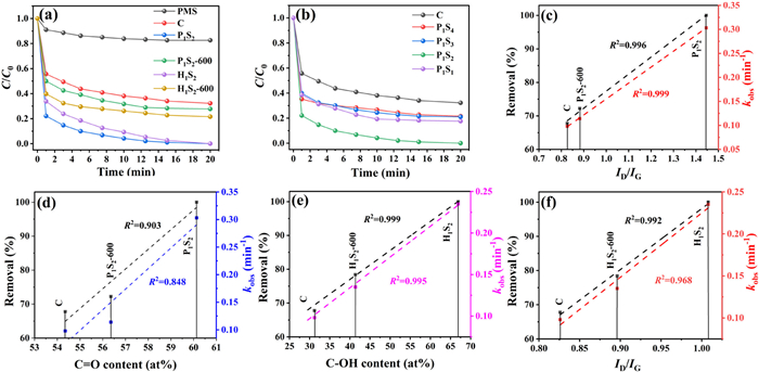 | Fig. 3. (a, b) TC degradation over various materials. Correlation of TC removal ratio along with kobs to ID/IG (c) and C═O content (d) over C, P1S2–600 and P1S2. Correlation of TC removal ratio along with kobs to C—OH content (e) and ID/IG (f) over C, H1S2–600 and H1S2. Reaction conditions were [TC]0: 10 mg/L, [PMS]: 0.6 g/L, [catalyst]: 0.10 g/L, pH: 6.8, T: 25 ℃. | |