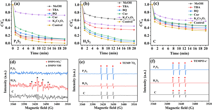 | Fig. 4. Effect of different quenching agents on TC removal over P1S2/PMS (a), H1S2/PMS (b), and C/PMS (c) systems. EPR tests for •OH and SO4•−(d), 1O2 (e) as well as e- (f) of above systems. Reaction conditions were [TC]0: 10 mg/L, [PMS]: 0.6 g/L, [catalyst]: 0.10 g/L, pH: 6.8, T: 25 ℃. | |