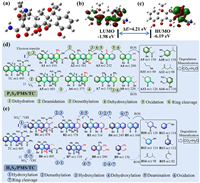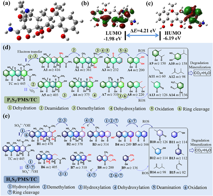 | Fig. 6. Optimized TC structure (a). LUMO (b) and HOMO (c) of TC. The possible TC removal pathways over P1S2/PMS (d) and H1S2/PMS (e) systems. | |