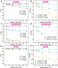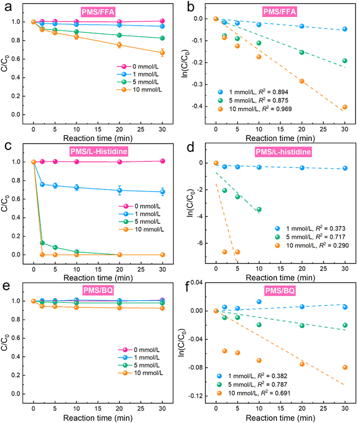 | Fig. 2. (a) PMS decomposition in the presence of different concentrations of FFA and (b) corresponding pseudo first-order rate constants. (c) PMS decomposition in the presence of different concentrations of L-histidine and (d) corresponding pseudo first-order rate constants. (e) PMS decomposition in the presence of different concentrations of BQ and (f) corresponding pseudo first-order rate constants. Experiment conditions: [PMS]0 = 1 mmol/L, T = 25 ℃. | |