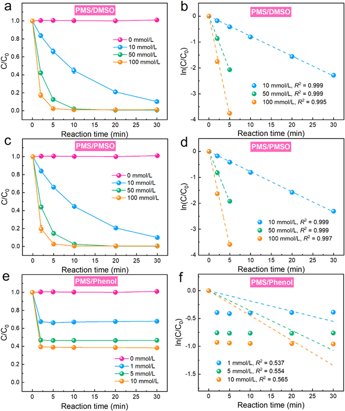 | Fig. 3. (a) PMS decomposition in the presence of different concentrations of DMSO and (b) corresponding pseudo first-order rate constants. (c) PMS decomposition in the presence of different concentrations of PMSO and (d) corresponding pseudo first-order rate constants. (e) PMS decomposition in the presence of different concentrations of phenol and (f) corresponding pseudo first-order rate constants. Experiment conditions: [PMS]0 = 1 mmol/L, T = 25 ℃. | |