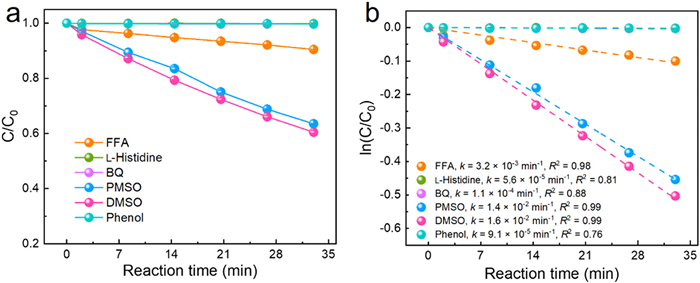 The measured second-order rate constants of FFA, L-histidine, BQ, PMSO, DMSO, and phenol with PMS were shown in Table 1. As shown in Fig. 4a, the results showed that PMSO and DMSO had faster reactions with PMS and FFA had a slower reaction rate with PMS, which was in accordance with the experimental results that the quencher consumed the oxidant. However, Fig. 4b displayed that the reaction rates of L-histidine, BQ and phenol with PMS were so slow as to be negligible, which did not match the previous experimental results.