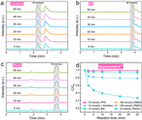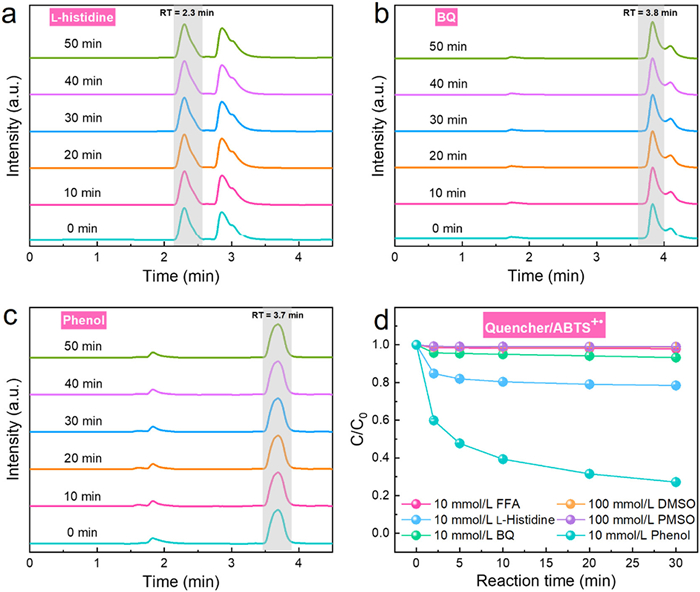 In addition, since the reaction of PMS with L-histidine and BQ was widely accepted [36-38], and the consumption of PMS in L-histidine, BQ, and phenol systems did not conform to the reaction kinetics process (Figs. 2d and f, and 3f). We further validated our results by monitoring the change in quencher over time by high-performance liquid chromatography (HPLC) in the presence of PMS overdose. As shown in Figs. 5a-c, there was no significant change in the intensity of the characteristic peaks of L-histidine, BQ, and phenol with time, which further proved that the reaction between PMS and L-histidine, BQ, and phenol was slow enough.
