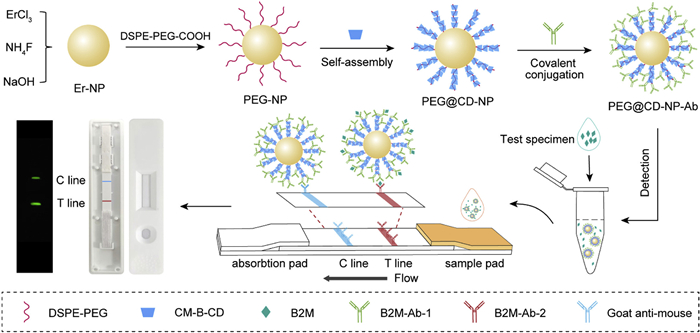 | Fig. 1. Schematic illustration of the cyclodextrin-mediated antibody immobilization on upconversion nanoparticles for CKD biomarker sensing via quantitative luminescent lateral flow assay. | |