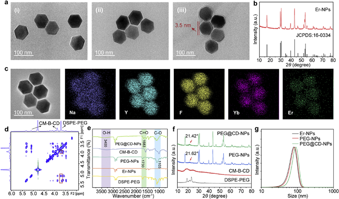 | Fig. 2. (a) TEM images of Er-NPs (i), PEG-NPs (ii), and PEG@CD-NPs (iii). (b) Comparison between the experimental X-ray diffraction (XRD) pattern (top) and the standard hexagonal phase NaYF4 XRD pattern (JCPDS: 16–0334) (bottom) of the Er-NPs. (c) TEM image and corresponding EDS element mapping images of the Er-NPs. (d) 2D NOESY NMR spectra of the mixture of DSPE-PEG-COOH and CM-B-CD. FT-IR spectra (e) and XRD patterns (f) of Er-NPs with different surface modifications. (g) Size distributions of Er-NPs, PEG-NPs and PEG@CD-NPs determined through DLS experiments. | |
