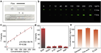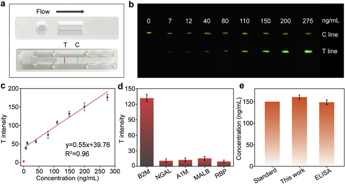 | Fig. 5. (a) Photographs of the LFA test strip, where the red line indicates the test line (T line) and the blue line indicates the control line (C line). (b) Upconversion luminescence images of PEG@CD-NP-Ab nanoprobe-based LFA strips with different concentrations of B2M standard solutions under 980 nm laser irradiation. (c) Linear relationships between the signal intensity at the T lines and the concentrations of B2M (mean ± SD, n = 3). (d) Selectivity evaluation of the developed LFA strips towards common CKD biomarkers at their physiological levels, from left to right: 150 ng/mL, 7.2 ng/mL, 9 µg/mL, 15 µg/mL, and 0.5 µg/mL (mean ± SD, n = 3). (e) Accuracy assessment of the developed LFA strips for the detection of standard B2M samples in artificial urine. | |