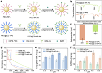 | Fig. 4. (a) Schematic representation of the preparation process for PEG-NP-Ab and PEG@CD-NP-Ab, along with their binding affinity to B2M. (b) FT-IR spectra, (c) zeta potential and (d) UV-visible absorption spectra of PEG@CD-NP and PEG@CD-NP-Ab. (e) Assessment of the conjugated antibodies on PEG-NP-Ab and PEG@CD-NP-Ab fabricated under varying pH conditions. (f) Binding rates of PEG-NP-Ab and PEG@CD-NP-Ab nanoprobes produced under different pH conditions towards B2M. | |