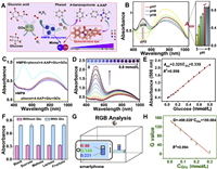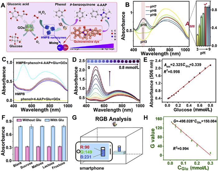 | Fig. 3. (A) Schematic diagram of the one-pot multicolorimetric method for the detection of H2O2 and glucose. (B) The catalytic activity of HMPB nanozymes for 4-AAP/phenol oxidation at different pH. (C) glucose detection feasibility analyses corresponding to UV–vis spectra. (D) The absorption spectra of glucose at concentrations of 0–0.8 mmol/L were present. (E) Correlation between A506 and glucose concentration. (F) Selectivity experiment for detecting glucose (Glu: 200 µmol/L, Interferents: 2 mmol/L). (G) Schematic diagram of glucose concentration detection by smartphone. (H) plot of G value vs. the concentration of glucose. Data are presented as mean ± SD (n = 3). | |
