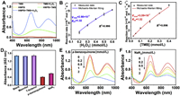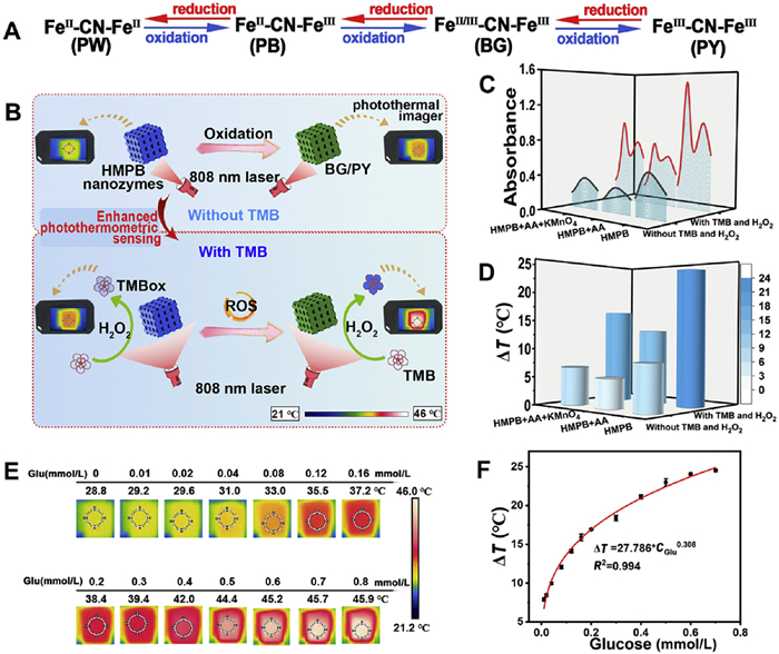 | Fig. 4. Schematic diagram of (A) the conversion of Prussian blue materials containing different valence states of Fe. and (B) integrating a dual thermal signal platform based on HMPB nanozymes. (C) UV–vis absorption spectra and (D) bar plot of temperature changes of AA/KMnO4 added to HMPB nanozymes system. (E) Infrared image of the system containing different concentrations of glucose irradiated by 808 nm laser with power density of 4 W/cm2 for 240 s. (F) Corresponding calibration curves. Data are presented as mean ± SD (n = 3). | |