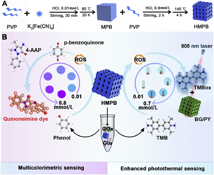Prussian blue analogs (PBAs) present a unique solution to these challenges through their intrinsic multifunctionality [17]. Beyond demonstrating excellent POD-like activity, PBAs exhibit distinctive chromogenic properties and exceptional photothermal conversion efficiency [18,19]. Capitalizing on these characteristics, we synthesized and engineered a hollow mesoporous Prussian blue (HMPB) nanocubes based system for one-step and dual-modal sensing glucose under neutral conditions. The HMPB nanocubes were fabricated based on a simple hydrothermal method by etching mesoporous Prussian blue with hydrochloric acid (Scheme 1A). Specifically, as shown in Scheme 1B, the system operates via one-step enzyme-nanozymes cascade system: (1) GOx-generated H2O2 activates HMPB's POD-like activity under neutral conditions to catalyze 4-AAP/phenol oxidation, generating red quinone dyes that synergize with HMPB's intrinsic blue coloration for establishing a self-chromogenic multicolorimetric response readout. (2) HMPB-catalyzed TMB oxidation and integrating the intrinsic photothermal properties of HMPB nanozymes generating an enhanced photothermometric response readout. By eliminating pH adjustments and integrating dual signal modalities, this platform overcomes traditional enzyme-nanozymes cascade limitations of multi-step operations and physiological incompatibility. This work establishes a new biosensing paradigm where HMPB multifunctional nanozymes serve dual roles both as a catalytic activator and an intrinsic signal reporter, bridging laboratory research to point-of-care diagnostics through instrument-flexible smartphone and thermal camera readouts.