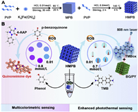 | Scheme 1. (A) The synthetic flow of the proposed HMPB nanozymes. (B) One-step and dual-modal glucose detection based on multifunctional HMPB nanozymes system under neutral conditions. | |