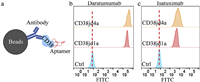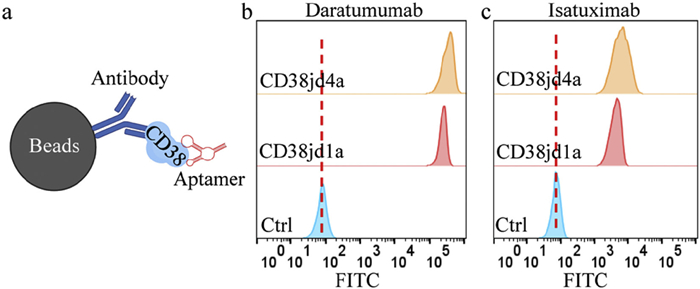 | Fig. 3. Binding epitopes of aptamers against CD38. (a) Schematic diagram of aptamer binding to CD38 immobilized by antibodies. (b) Binding of aptamers to CD38 immobilized with Daratumumab by flow cytometry. (c) Binding of aptamers to CD38 immobilized with Isatuximab by flow cytometry. | |