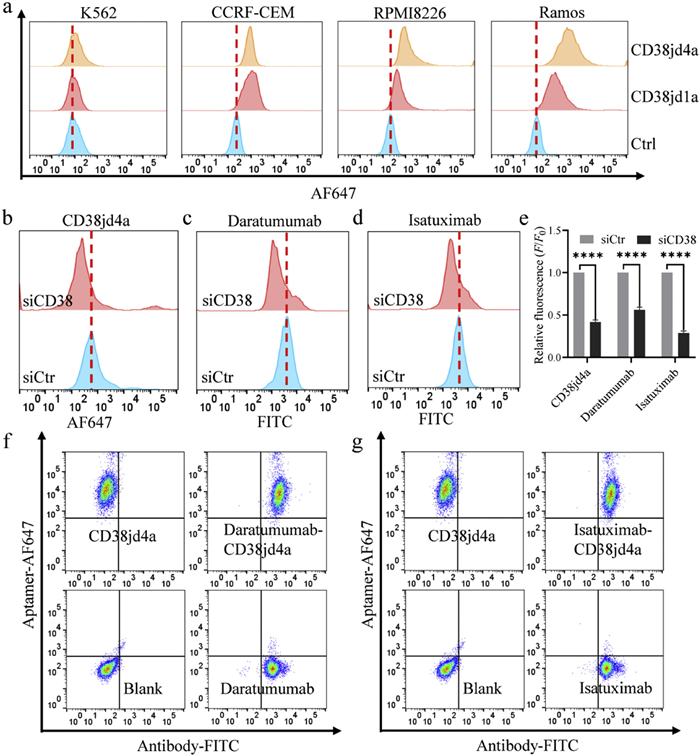 | Fig. 4. Binding profiles of aptamer CD38jd4a to CD38 on cell surface. (a) Binding of aptamers with K562, CCRF-CEM, RPMI8226, and Ramos cell lines characterized by flow cytometry. Binding of CD38jd4a (b), Daratumumab (c) and Isatuximab (d) to Ramos cells treated with siCD38 or siControl (siCtr) RNA by flow cytometry. (e) Histogram with statistical analysis of (b, c and d). Co-staining of AF647-labbled CD38jd4a with FITC-labeled Daratumumab (f) and Isatuximab (g) respectively by flow cytometry on Ramos cells. | |