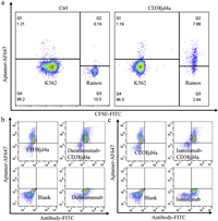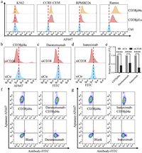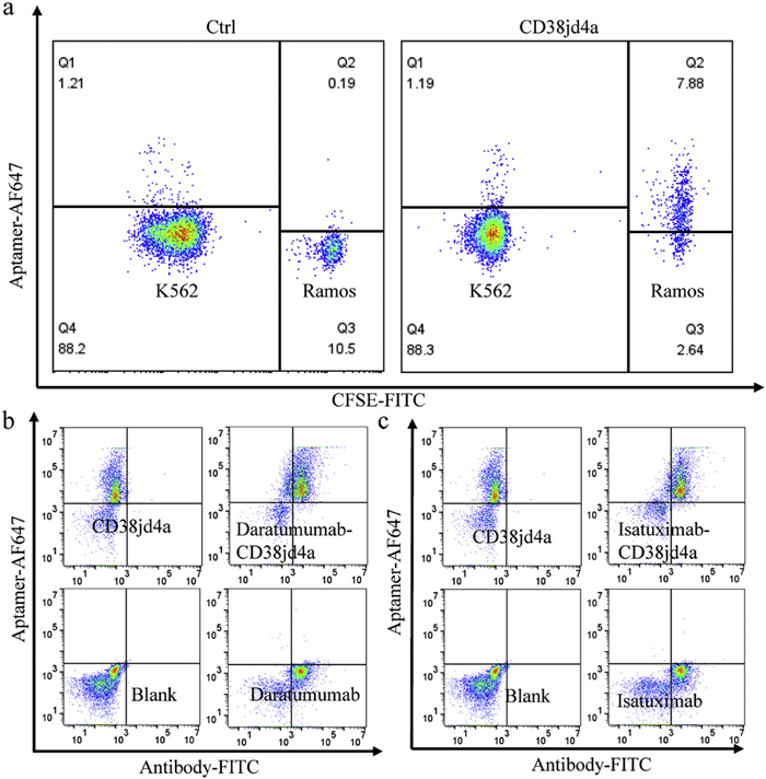 | Fig. 5. Detection of CD38 positive samples by aptamer CD38jd4a. (a) CD38jd4a-based detection of CD38 positive cell populations in a mixture of 90% K562 and 10% Ramos. Co-staining of CD38jd4a with Daratumumab (b) or Isatuximab (c) to CD38-positive cells in clinical blood samples. | |