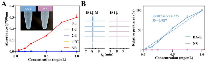 The encapsulation of guest molecules in BA-L NMs was further validated through relatively quantitative analysis. Four volatile components, including borneol, menthone, β-elemene, and muscone, were quantitatively analyzed using GC–MS (Table S1), while others were monitored by LC–MS (Table S2 and Fig. S2 in Supporting information). As a result, BA-L NMs demonstrated the enhanced solubilization efficacy, and particularly, more than two-fold solubility improvement occurred for the high-concentration groups belonging to 23 bioactive compounds, comprising 11 flavonoids, 3 terpenoids, 3 alkaloids, and 6 other natural products. Notably, isoliquiritigenin, licochalcone A, and muscone exhibited excellent solubility as aforementioned (Fig. 1B and Fig. S3 in Supporting information). Representatively, muscone was totally insoluble in normal saline because it was almost undetectable when being dispersed in normal saline. However, following the addition of BA-L NMs, the relative peak areas of muscone exactly showed a linear increment with the fortified amounts (y = 107.47x + 4.325, R2 = 0.987), even being comparable with the values of those serial standard solutions (Fig. 1B). Similar results were also observed for either isoliquiritigenin or licochalcone A (Fig. S3). The natural products whose turbidity decreased and/or solubility increased were summarized in Fig. S4 (Supporting information). Moreover, the well-defined approaches, such as Tyndall effect evaluation and DLS-based particle size measurement were jointly employed to consolidate the results. As expected, the results exactly justified the aforementioned findings (Fig. S5 in Supporting information).