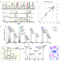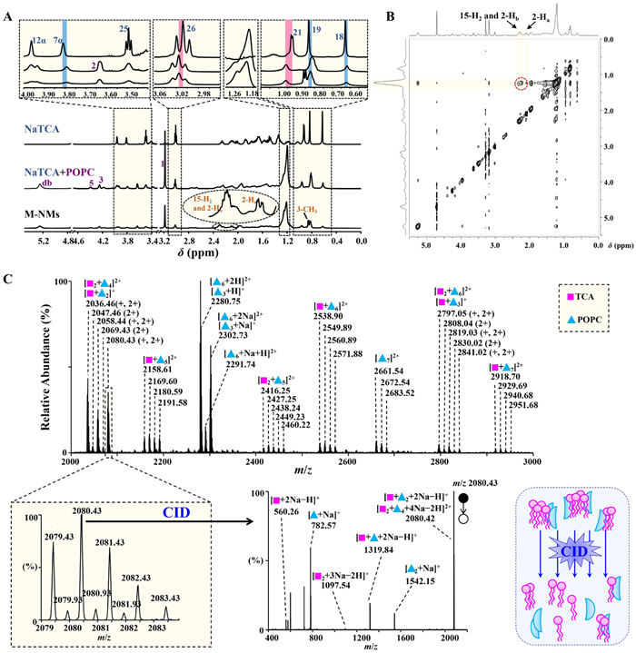 | Fig. 3. Spectroscopic properties of M-NMs. (A) 1H NMR spectra of NaTCA, NaTCA+POPC, and M-NMs. (B) NOESY spectra of M-NMs. (C) MS1 spectrum of M-NMs at m/z 2000–3000 and representative MS/MS analyses of polymer at m/z 2080.43. | |