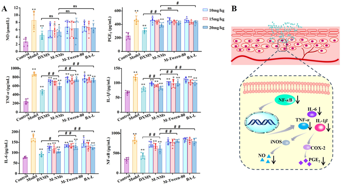 | Fig. 5. Anti-inflammatory effects of M-NMs. (A) Measurement of serum NO levels in mice using the Griess Reagent and ELISA assays for determinations of PGE2, TNF-α, IL-1β, IL-6, and NF-κB. ٭٭P < 0.05 vs. control group, *P < 0.05, **P < 0.01, ***P < 0.001 vs. model group. #P < 0.05, ##P < 0.01 vs. M-NMs high dose group, ns: no significance. (B) Schematic illustration of the dermal delivery process and the anti-inflammatory mechanism of M-NMs. | |