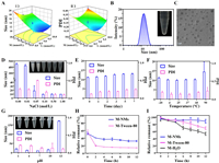 | Fig. 2. Fabrication and physicochemical characterization of M-NMs. (A) 3D response surface diagram of independent variables formulas of lecithin (L) and muscone (M) and dependent variables size and PDI. (B) DLS measurement of M-NMs size. Inset: photographic image of M-NMs under daylight. (C) TEM image of M-NMs. Variations of hydrodynamic sizes and PDI of M-NMs under different NaCl concentrations (D), time points (E), temperatures (F), and pH levels (G). (H) Stability evaluation of M-NMs in DMEM. (Ⅰ) Relative residual measurement of muscone after exposure to a continuous stream of air. | |