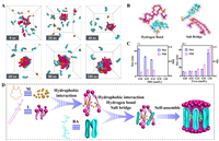 | Fig. 4. The self-assembly mechanism of M-NMs. (A) Spontaneous aggregation of a random solution of TCA, POPC, and Muscone into mixed micelles. TCA are shown in green except for the hydroxyl groups (red), POPC in light pink, and M in orange. (B) Intermolecular interactions in M-NMs featuring hydrogen bonding and salt bridges. (C) Variations of hydrodynamic sizes and PDI of M-NMs with the addition of SDS (i) and urea (ii). (D) The mechanism underlying the self-assembly of M-NMs. Hydrophobic interaction, hydrogen bonding, and salt bridge are revealed as the primary correlations amongst taurocholic acid, lecithin, and muscone. | |