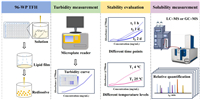 | Scheme 1. Schematic workflow of the 96-well plate-based screening platform for host-guest molecular interactions. The integrated procedure involves four sequential phases: (1) 96-well plate-based thin-film hydration (96-WP TFH), including dissolution of bile acid, lecithin, and hydrophobic natural products in organic solvent, solvent evaporation to form thin films, and hydration with aqueous solvent; (2) turbidity measurement at 750 nm using a microplate reader; (3) stability evaluation by measuring turbidity at different time points as well as multiple temperature levels; (4) relatively quantitative measurements by LC–MS or GC–MS. | |