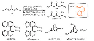 As required by the 'central chirality-controlled construction of axial chirality' strategy [31,32], it would be ideal to obtain the enantiopure centrally chiral precursor. We then started the investigation from asymmetric synthesis of the centrally chiral precursor 3a by rhodium-catalyzed asymmetric conjugate phenylation of indolyl dienone 1a with phenylboronic acid. As summarized in Table 1, chiral bisphosphine-ligated catalysts were able to promote the reaction, but only low yield and moderate stereoselectivity were attainable (entries 1 and 2). Chiral diene ligand [38] proved to be superior to bisphosphine ligand in terms of both reactivity and selectivity in this reaction system (entries 3 and 4), and excellent diastereoselectivity and enantioselectivity were obtained with L1 as the chiral ligand [39]. In addition to ethanol, other solvents such as dioxane and DCE were also suitable for this reaction (entries 4–6). The stereoselectivity was further increased (>20:1 dr, >99% ee) when the reaction was conducted at lower temperature, and the reaction worked equally well with only 1 mol% catalyst loading (entries 7 and 8).