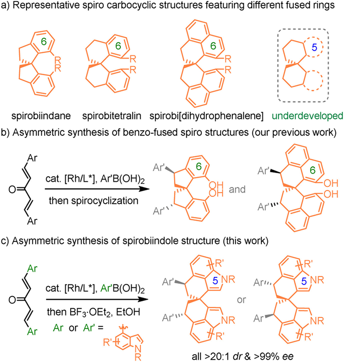 Spiro carbocycles are privileged structures for developing novel functional materials due to their unique orthogonally rigid structure and good thermal stability [1–4], and they are also frequently found in natural products and bioactive compounds [5–7]. Therefore, development of novel spirocarbocycles and their asymmetric synthesis have attracted much attention [8–12]. A particularly useful chiral spirostructure is the C2-symmetric one, which has found wide applications in chiral catalyst/ligand development [13–16]. It is noteworthy that the combination of different fused rings will dramatically affect the structural conformation, thus leading to diverse spirostructures that are suitable for different applications, as exemplified by the spirobiindane, spirobitetralin, and spirobi[dihydrophenalene] structures [17–21]. However, this type of spirostructures is mainly constructed based on the six-membered arene-fused rings, and the spirostructures featuring the five-membered heteroarene-fused rings remain underdeveloped (Scheme 1a).
