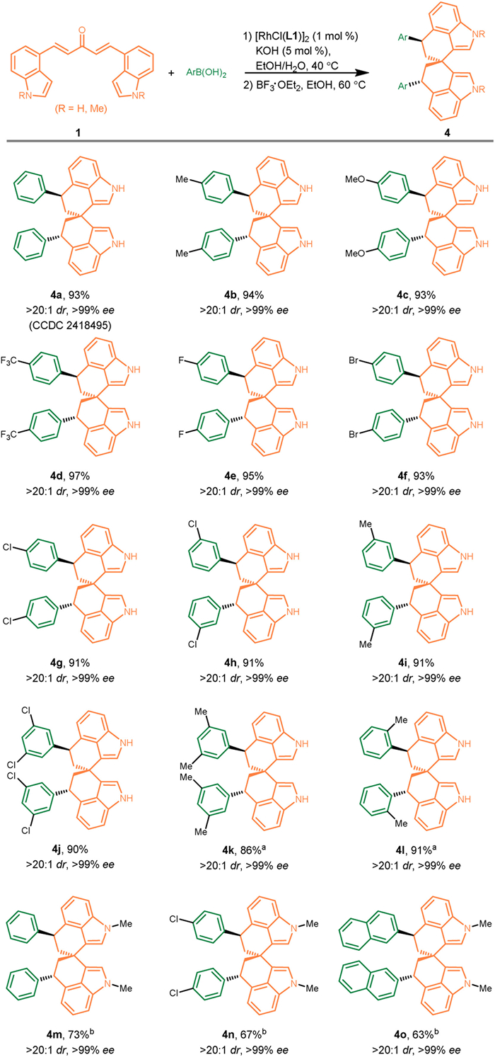 With the optimal conditions for asymmetric synthesis of spirobiindole structure, the substrate scope was next explored (Scheme 2). The conditions were found to be quite general for different substrates. Arylboronic acids bearing electron-donating groups, electron-withdrawing groups, and halides at different positions were all well tolerated (products 4b-4i). The sterically bulky 3,5-disubstituted or 2-substituted phenylboronic acids were also suitable (products 4j-4l). In addition, the N-protected indolyl substrates could be employed to construct the corresponding spirobiindoles (products 4m-4o). It is worth highlighting that >20:1 dr and >99% ee were obtained in all the examples.