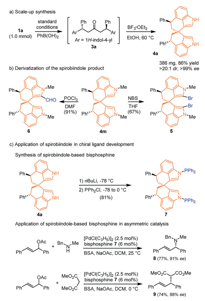 To showcase the practicality of the method, 1 mmol scale synthesis was performed (Scheme 4a), and the reaction still proceeded well to produce the spirobiindole 4a in high yield with excellent stereo control (>20:1 dr, >99% ee). Functionalization of the spirobiindole product was also demonstrated (Scheme 4b). For example, monoformylation product 6 was produced under the Vilsmeier–Haack reaction conditions. Treatment of 4m with NBS selectively delivered bromine to the 2-position of the indole ring. Application of the chiral structure in development of chiral ligand was also explored. As shown in Scheme 4c, bisphosphine 7 can be readily synthesized from spirobiindole 4a. Its catalytic performance as a chiral ligand was demonstrated by application in palladium-catalyzed enantioselective allylic amination and alkylation reaction, and high enantioselectivities were observed with N-methylbenzylamine (91% ee) and dimethyl malonate (88% ee) as the nucleophiles.