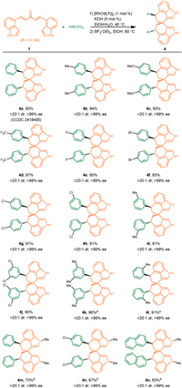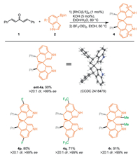 As shown in Scheme 3, the reaction also proceeded well with commercially available dibenzalacetone and indolylboronic acid pinacol ester under the established standard conditions, thus providing a practical synthesis route to the other enantiomer without changing the catalyst (ent–4a). The substituted indolylboronic acid pinacol esters, including the 2-substituted one, could be employed to produce the corresponding substituted spirobiindoles (4p-4r). The structure and absolute configuration of ent–4a was also confirmed by single-crystal X-ray diffraction analysis.