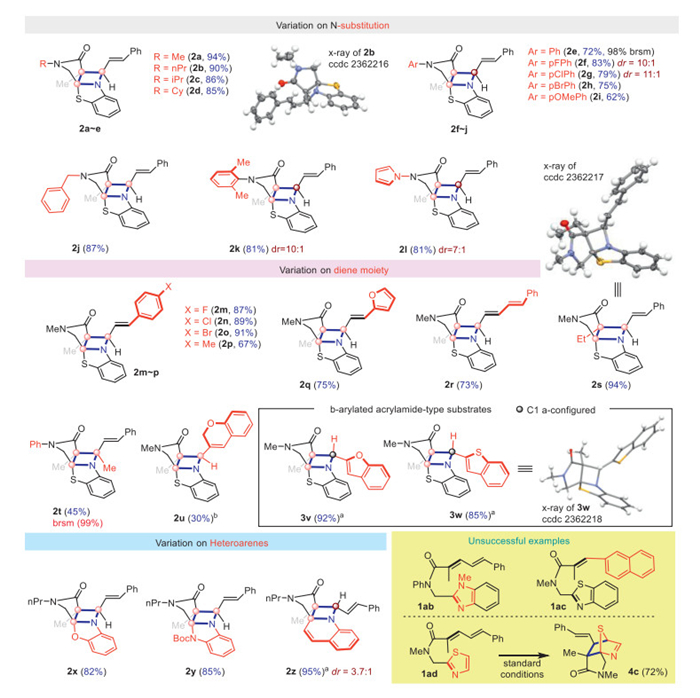 An investigation on the substituents effects on diene motif was further conducted. When changing diene terminal substitutions, no obvious para-substitution effect could be observed. Only single diastereoisomers were found and the isolated yields ranged from 67% to 91% yield (2m-2p). It was noted that furyl group was well tolerated under such redox-neutral conditions and desired product 2q was obtained in 75% yield as a single isomer. It is worthy to point out that even trienamide substrate 1r could be successfully converted to the desired aza-[2 + 2] cycloadduct 2r in very high chemo- and diastereo-selectivity (73% yield, single isomer). The alkyl substituent at α-position of dienamide was also investigated (1s). It was gratifyingly to find the ethyl-substituted products 2s in good yield (94%), whose relative configurations were confirmed by X-ray crystallography. Moreover, vicinal quaternary carbon centers could be established (2t in 45% yield) with tetra-substituted olefin 1t and 2u was obtained in 30% yield due to unexpected decomposition. Interestingly, the diastereoisomers (3v and 3w) could be isolated as the only products (92% and 85% yield, respectively), if TFE was not used as cosolvent. The relative configuration of 3w was confirmed by X-ray crystallography.