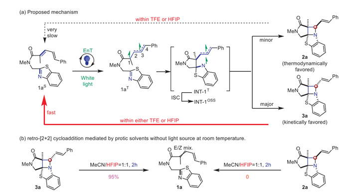Our next mission is to elucidate the reason why adding TFE as co-solvent is able to control the diastereoselectivity. To probe this, we first conducted two kinetic monitoring experiments using 1a. It was found that within the presence of TFE, the kinetic product 3a was formed as the major isomer (72% yield, see Supporting information for details) in 2 h. And then the amount of 3a was decreased with time until < 7% yield after 36 h of irradiation). Meanwhile, the yield of thermodynamic product 2a was correspondingly increased to 92%. In addition, their yields of 2a and 3a remained unchanged even after 60 h irradiation under blue LED light (Scheme 3a). On the other hand, 1a was also subjected to TFE-free standard conditions and the ratio between product 3a and 2a was slowly eroded from 2.4:1 to 1.2:1, featuring kinetic isomer 3a as the major product. These indicated that an inter-conversion from 3a to 2a could be existing or a reverse aza-[2 + 2] cycloaddition could be operating within the presence of TFE. We observed that only trace amount of kinetic product 3a could be detected by subjecting 2a under standard conditions. Contrastingly, 90% yield of 2a was isolated if exposing 3a under standard conditions. This revealed a thermodynamic control and implied why 2a could be observed as a single diastereomer (Scheme 3b). Then we treated 2a and 3a with standard conditions but without light irradiation. 1a could be isolated in 12% and 98% yield, respectively (Scheme 3c). These data revealed that a reverse aza-[2 + 2] cycloaddition was triggered under acidic additive (TFE forming H-bonding with the tertiary amine in 2a/3a). Contrastingly, a cyclobutane analogue (2ag/3ag) would not undergo such a process, even within the presence of TFE (Scheme 3d). Toward this end, we have elucidated the mechanism for diastereoselective control of our aza-[2 + 2] reaction. To validate that the dienamide was key for photosensitizer triplet energy transfer, we conducted a Stern-Volmer quenching experiment with substrate 1a, its subunits dienamide 1ae and 2-methyl benzothiazole 1af. The slope values indicated that dienamide moiety (1a and 1ae) is key for energy transfer from the excited triplet state of photosensitizer, while the benzothiazole moiety (1af) should not be responsible (Scheme 3e).