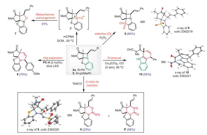 With the confidence gained from the above test, we set off to explore the aza-[2 + 2]'s synthetic applicability. Since we are able to access the densely decorated azetidines bearing contiguously stereocenters, it would be ideal to do ring expansions, which allow us to access the more commonly encountered aza five- and six-membered rings (Scheme 5). We attempted a Meisenheimer rearrangement starting from azetidine 2a, the desired isoxazol product 7 could be obtained in 91% yield. Then a scaffold hopping from vinyl azetidine 5 to piperidine 8 (70% yield) was realized through photoredox mediated reductive quenching of PC-4 with compound 5. The net [4 + 2] cycloadduct proved practicality in forging piperidines from dienamide. Additionally, the C—N bond could be formally disconnected and inserted by "C=N" bond or "C=O" bond of TsC=N=O, leading to the formation of 9 (33% yield) and 9′ (56% yield). The structure of 9 was unambiguously verified by crystallography. The sulfur atom could be removed by treating compound 2a with catalytic amount Co2(CO)8 under CO atmosphere. A dihydro carbazole skeleton can be formed in 55% yield. Last but not least, a selective oxidation was performed with 2a using hydroperoxide, obtaining benzothiazole dioxide 6. It allowed sequential oxidation of azetidine 2a possible.