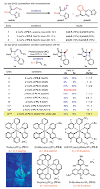 We started with sub-A (Scheme 1a), which can be prepared through amide coupling between the N-(thiazol-2-ylmethyl)aniline and cinnamic acid (see Supporting information for details). When irradiating sub-A with blue LED in the presence of 2 mol% of photosensitizer (PC), no desired product can be detected except for starting material recycling (sub-A: 78% and 10% yield, respectively) and olefin isomerization (prod-Ⅰ: 22% and 80% yield, respectively in entries 1 and 2). The predicted oxidative 6π cyclization prod-Ⅱ could be detected in 76% yield, along with 16% of prod-Ⅰ (entry 3). The olefin isomerization implied that the energy transfer took place, but the triplet diradicals' life time is too short. And thioazole dearomatization was difficult compared to the 6π cyclization as the high ET photosensitizer, PC-3 only triggered the latter reaction.