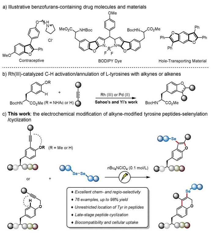 The benzo[b]furan nucleus serves as a fundamental building block for numerous pharmaceuticals [1] and dyes [2,3] due to its significant biological activity and electronic transmission properties (Scheme 1a). In recent years, the cyclization of tyrosines featuring a benzo[b]furan skeleton [4–8], catalyzed by transition metals, has been reported (Scheme 1b). Among the methods for directly constructing the benzo[b]furan skeleton [9,10], those that utilize transition metals offer an attractive opportunity for sustainable peptide modification of tyrosines, owing to their versatility and cost-effectiveness. The appeal of phenolic derivatives in protein modification [11,12] and drug development, along with the prominent role of selenium-containing compounds [13,14] in peptide drugs, underscores the desirability of direct cyclization and selenization of tyrosine derivatives as a strategy for amino acid modifications [15]. Over the past decade, significant efforts have been made to enhance the functionalization of the aromatic ring in tyrosine using complexes of iron [16,17], palladium [18–23], nickel [24], rhodium [25,26], ruthenium [27,28], and others [29,30]. Despite this undeniable progress, chemical oxidants are often required to achieve specific stoichiometries, leading to undesirable waste products and metal residues that compromise overall atom economy and green synthesis pathways. In light of this, new synthetic methods such as photocatalysis [31–37], electrochemical synthesis [38–42], and enzyme catalysis [43] have emerged to address the limitations of metal-catalyzed-cyclization. However, there remains a lack of diverse synthetic approaches for tyrosine peptide reactions that incorporate unique skeletons and functional groups.
