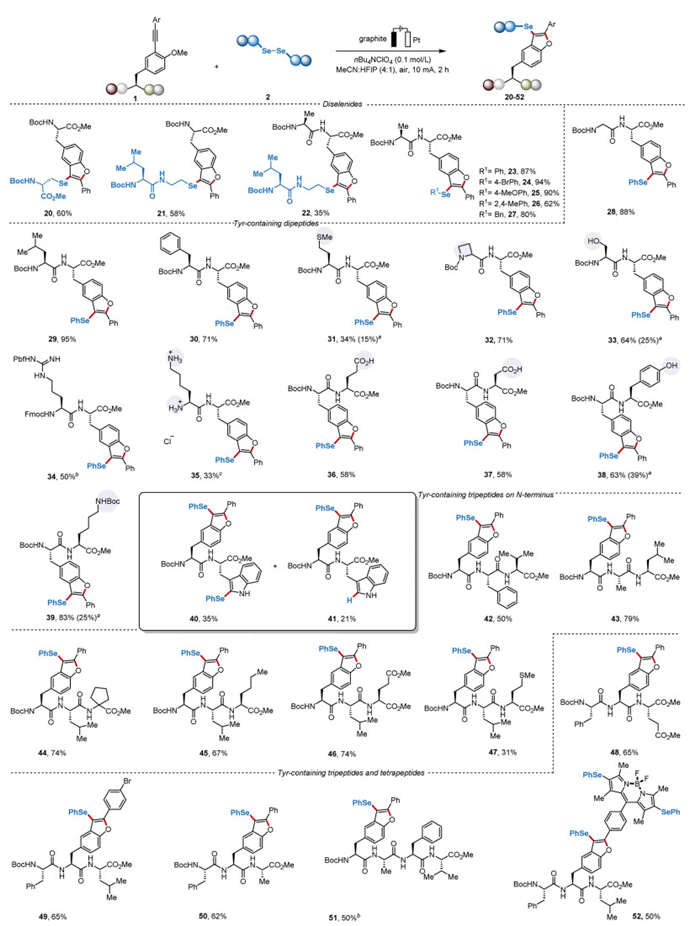 Considering the unique advantages and latent potential of selenylation modifications in peptides, and based on our recent research interest in electrochemical peptides, we selected various types of diselenides and alkyne-modified tyrosine oligopeptides to explore new potentially pharmaceutically active tyrosine derivatives through the cyclization of selenides (Scheme 3). As shown, the selenium-substituted amino acids appeared to be quite compatible and delivered peptide derivatives (20–22) when compared with commercially available diselenides building blocks. Furthermore, a wide range of aryl and alkyl diselenides could be successfully incorporated into the phenolic motif of Tyr residues, resulting in the benzo[b]furan tyrosine products 23–27 with excellent yields. Notably, dipeptides bearing Gly, Leu, Phe, Met, Ser, Arg, Lys, and Trp at the C-terminus performed well under standard conditions, providing the corresponding products with moderate to excellent yields (28–35). Moreover, tripeptides containing Tyr residues at the N-terminus could also be effectively functionalized, yielding products 42–47, although there was a significant decrease in yield with Met. Surprisingly, we were pleased to discover that the cyclization of Tyr-containing peptides with non-specific positions was also successful using this protocol, affording the modified tripeptides and tetrapeptides 48–51. Even when bearing the biocompatible fluorescent BODIPY group, the target product 52 was obtained in moderate yields.