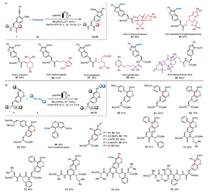 | Scheme 4. (A) Late-stage functionalization via electrochemical selenylation of alkyne-modified tyrosine peptides. (B) Scope of constructing benzopyran derivatives using alkyne-modified tyrosine oligopeptides. Isolated yields are reported. a nBu4NHSO4 (0.1 mol/L) instead of nBu4NClO4 (0.1 mol/L). b 4 h (2.5 F/mol). | |