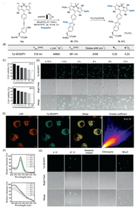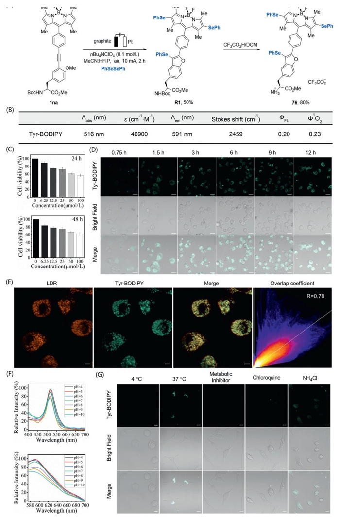 To further assess the biological application potential of this compound series, compound 76 (Scheme 5A), a selenotyrosine-conjugated fluorescent probe with favorable photophysical properties, was selected for initial investigation of cellular uptake and bioimaging (Scheme 5 and Figs. S2-S10 in Supporting information). The biocompatibility of the compound was assessed using the MTT assay, a standard method for measuring cell viability. To avoid the influence of the absorption of the compound, the absorption value at a wavelength of 600 nm was recorded. The results indicated no significant cytotoxic effects on A549 cells, with IC50 values exceeding 100 µmol/L after 24 or 48 h of incubation (Scheme 5C). Furthermore, through the optimization of cell culture conditions, the fluorescence signal of the compound showed no obvious change after a 3-h incubation, indicating that the uptake equilibrium time of the compound in A549 cells was approximately 3 h (Scheme 5D). Moreover, experimental evidence on phototoxicity and biostability demonstrates that compound 76 has no significant impact on the imaging studies performed in this work (Figs. S7 and S10). The co-staining experiment with a commercial dye (Lysotracker Deep Red, LDR) revealed favorable co-localization between Tyr-BODIPY and LDR. These results indicated a specific lysosomal distribution within A549 cells, highlighting the compound's potential for precise subcellular organelle aggregation (Scheme 5E). To confirm this phenomenon, physiological pH-dependent photoluminescence fluctuations were considered. The results indicated that under neutral to acidic conditions (pH 4–7), the fluorescence signal exhibited only a modest change (<10%), whereas in the corresponding neutral to alkaline environment (pH 7–10), the fluorescence signal variation was somewhat greater (~20%) (Scheme 5F). This could be attributed to the formation of ionic compounds under alkaline conditions. Energy inhibition and partial endocytosis inhibitors significantly reduced the compound's fluorescence signal, implicating energy-dependent endocytic pathways in cellular internalization, a common mechanism for nanoparticle uptake (Scheme 5G). Considering the similarities among molecules in this series, it is likely that similar molecules may utilize energy-dependent endocytosis for localization within lysosomes. These preliminary results can guide the expansion of molecular libraries and further exploration into biological applications.
