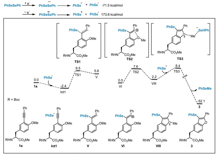 As illustrated in Scheme 6, the reaction mechanism initiates with the cathodic reduction of diselenide, exothermically generating a selenium radical and a selenide anion. The selenium radical then undergoes addition to alkyne 1a through transition state TS1 with an activation barrier of 8.9 kcal/mol, forming intermediate Ⅴ. Subsequently, Ⅴ is anodically oxidized to generate carbocation Ⅵ, which undergoes cyclization via transition state TS2 with an activation barrier of 7.6 kcal/mol, affording carbocation intermediate Ⅷ. Finally, Ⅷ reacts with the selenide anion (PhSe-) through transition state TS3 with an activation barrier of 6.2 kcal/mol, yielding the cyclic selenium product 3 and releasing PhSeMe. This final step is accompanied by significant heat evolution, consistent with the exothermic nature of the overall process.